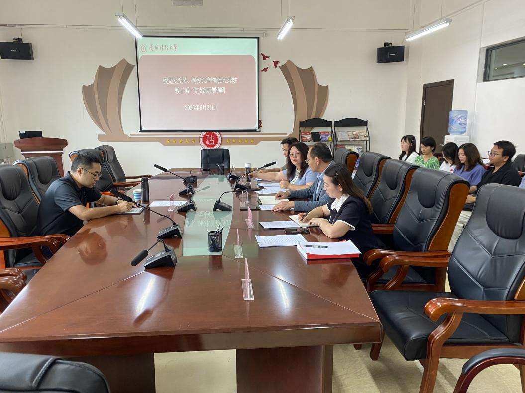 (首页 杨森井 张姝报道/摄影)2025年6月30日下午,贵州财经大学党委委员、副校长曾宇航到工作联系点首页教工第一党支部开展调研指导,并与支部党员教师座谈交流。支部党员、首页党委书记邵新顺、党委副书记彭华、副院长兼支部书记宋昭澜及支部党员教师共20余人参加。会议由宋昭澜主持。