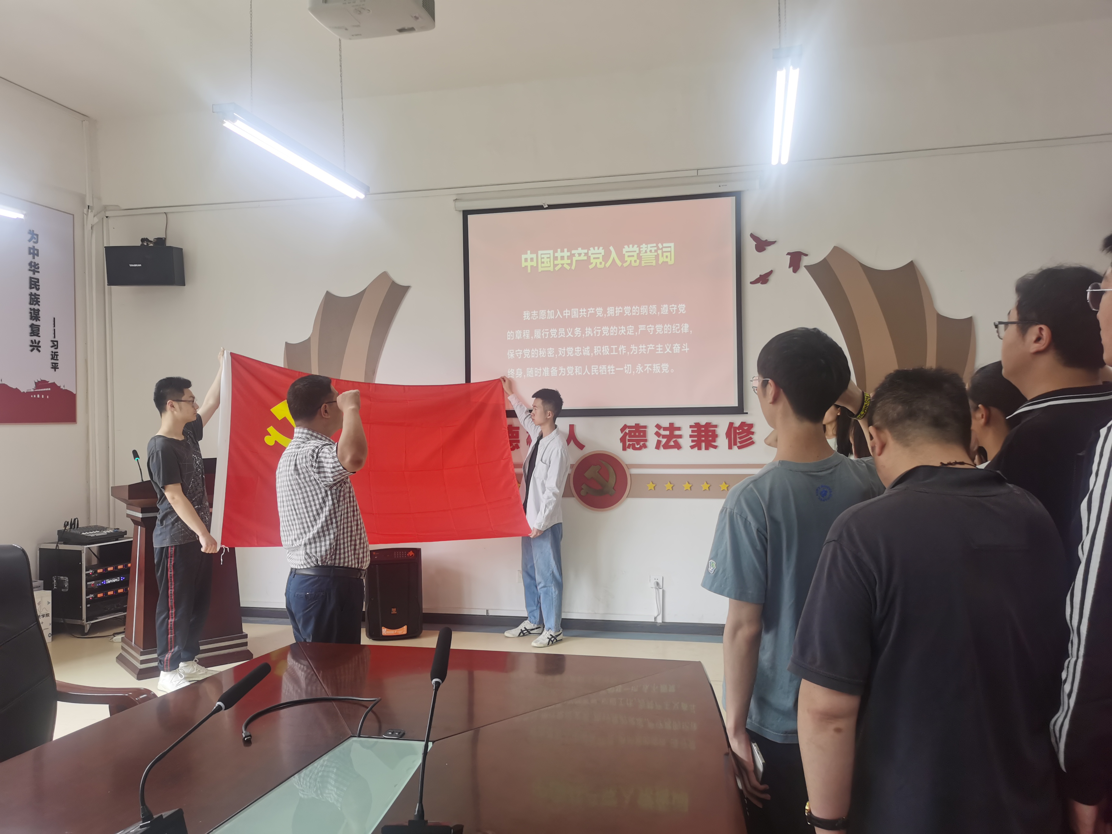 会议开始,新党员齐声高唱《国际歌》;全体新党员在詹伟同志的带领下面对鲜艳的党旗,举起右拳庄严宣誓。入党宣誓后,本科生党员余全金和研究生党员张诣深分别代表新发展党员向党组织表决心。