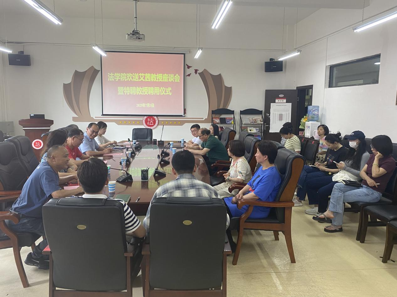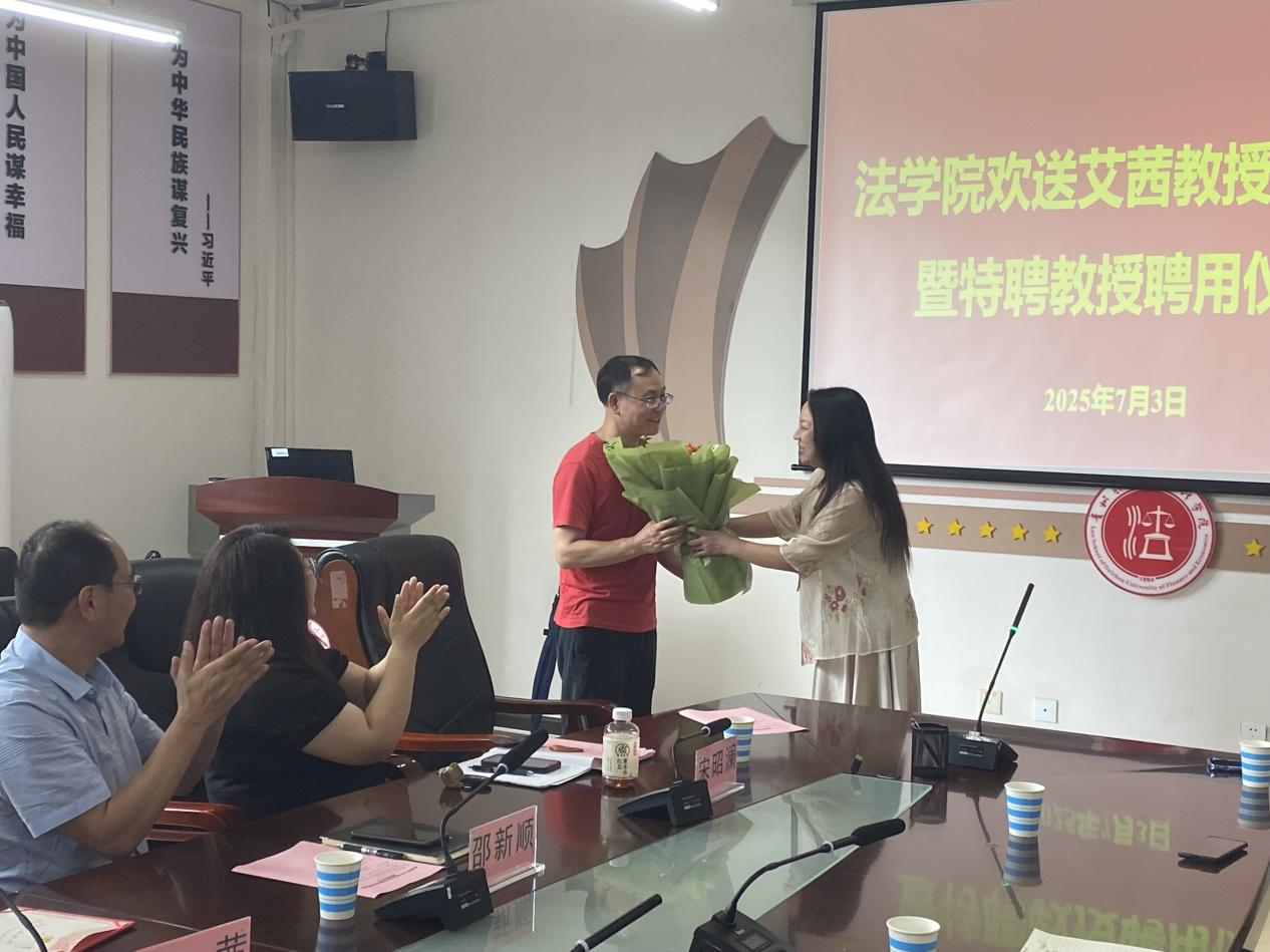 邵新顺回顾了2023年8月以来艾茜受中央财经大学委派到我院进行对口支援建设工作的点点滴滴。他克服了来自家庭、工作和生活习惯等多方面的困难,对学院的教学、科研以及我院与中央财经大学首页之间的交流做出了积极贡献,他对艾茜表示深深的感谢。贺婷提到艾茜受聘为时博在线登录入口法律顾问处的专家顾问,参与组织了一些疑难案件的讨论,提供了一些建设性的法律意见,并为时博在线登录入口做相关法务工作的专题讲座。宋昭澜感谢艾茜促成两校首页共同建立商法研究中心,开展了一系列卓有成效的工作并取得了相关科研成果。与会教师代表也积极发言,对艾茜提供的教学和科研方面的帮助和建议表示感谢。曹务坤为艾茜颁发了特聘教授证书,希望艾茜回到中央财经大学之后,能够继续为两院之间的交流合作发挥积极作用,帮助我院行稳致远。艾茜表示,自己将继续致力于推动两院之间的交流合作,互通有无,实现资源共享、优势互补,以专业合作为抓手,共同推动两校的事业高质量发展。