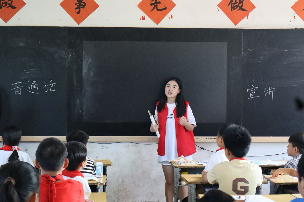课堂上,主持队孟远欣通过故事讲述、角色扮演、诗歌朗诵等趣味形式,引导孩子们学习普通话。她用因方言引发误会的小故事,让孩子们直观感受到普通话的重要性。随后,孩子们积极参与角色对话,课堂气氛热烈。