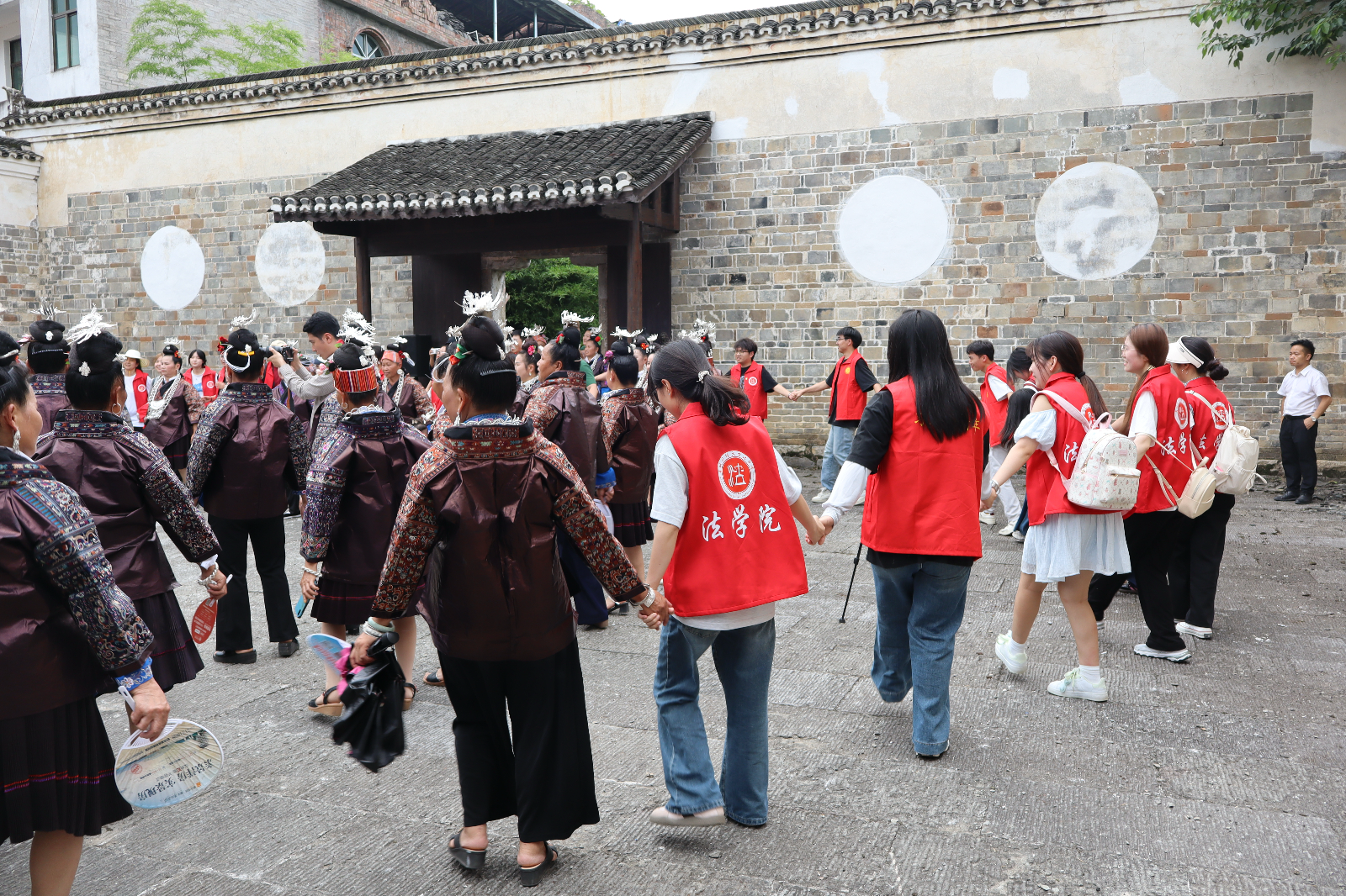 在苗族研究院,实践团队与专家学者深入交流,共话民族文化与法治融合,探讨如何将苗族传统习俗与现代法治有机结合,为乡村治理提供新思路;在施洞法庭,实践团队与庭长探索调解与民族习俗的相互影响,学习法庭在处理民族地区纠纷时的创新经验,为法治乡村建设提供有益参考;在文化振兴方面,团队成员带来的青春热舞助力村BA,点燃赛场激情,丰富村民文化生活;推广普通话活动,帮助村民提升语言沟通能力,更好地融入现代社会;制作苗族银饰活动,将非遗文化与法治创新相结合,通过与非遗传承人就银饰品牌打造、非遗技艺传承中的法律问题进行探讨,助力非遗文化在法治轨道上实现创造性转化和创新性发展。夜幕降临,篝火晚会上,“青春法盾,无毒无艾”队带来的诗歌朗诵《青春中国》以真挚的情感和激昂的语调演绎经典,展现青春力量,传递爱国情怀,省委组织部驻岗党略村第一书记唐林海和带队老师潘吉脉纷纷登台献唱,现场反响热烈。师生与村民们载歌载舞,在欢声笑语中增进了彼此的感情,也让民族团结之花在苗寨绚烂绽放。